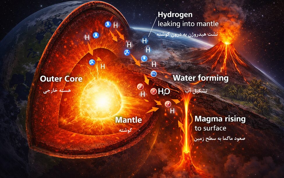 پژوهش فوریه ۲۰۲۶ در Nature Communications نشان میدهد هسته زمین حاوی مقادیر قابلتوجهی هیدروژن است که اگر با اکسیژن واکنش دهد، میتواند معادل ۹ تا ۴۵ برابر حجم اقیانوسهای زمین آب تولید کند. این کشف، درک ما از چرخه عمیق آب و منشأ آب زمین را تغییر میدهد. هیدروژن میتواند به مرور به گوشته نفوذ کرده، آب تولید کند و فعالیتهای آتشفشانی و تولید ماگما را تقویت کند و چشمانداز تازهای از ساختار داخلی زمین و ذخایر پنهان آب ارائه دهد.