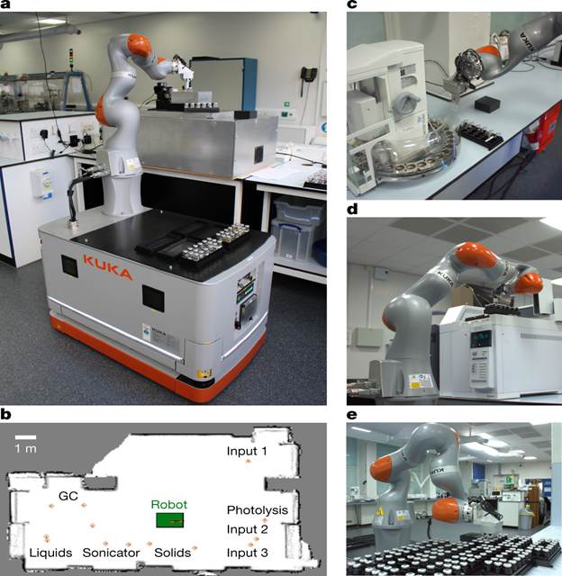 یکی از نمونههای برجسته در این زمینه، روبات متحرک ساخته شده توسط گروهی از دانشگاه لیورپول است که توانایی انجام آزمایشهای پیچیده فوتوکاتالیز را دارد. این روبات، قادر است آزمایشهای مربوط به تولید هیدروژن از آب با استفاده از نور خورشید و کاتالیزورهای فوتوشیمیایی را به صورت کاملاً خودکار انجام دهد.